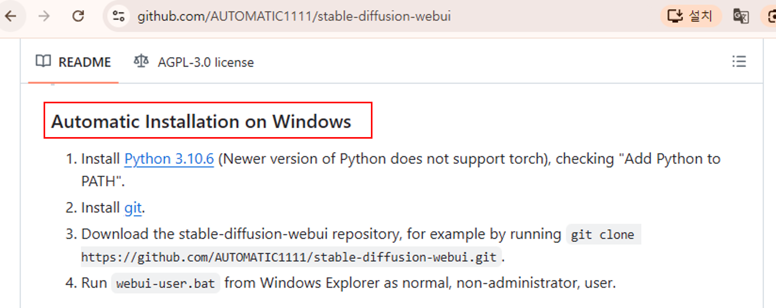 먼저 Stable Diffusion WebUI 공식 저장소에 접속합니다.