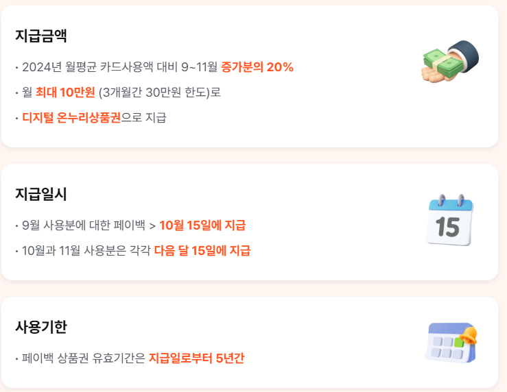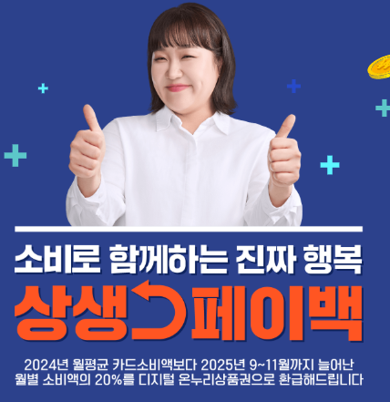 정부가 추진하는 상생페이백은 2024년 월평균 카드 사용액 대비 2025년 9~11월 카드 사용 증가분의 20%를 환급해주는 사업입니다.