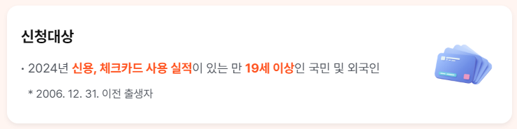 - 지원 대상: 2024년 카드 사용 실적이 있는 만 19세 이상 국민 및 외국인 (2006년 12월 31일 이전 출생자)