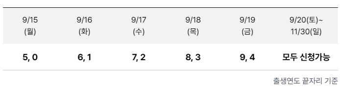 -시스템 점검 시간(23:30~00:30)에는 신청 불가 - 출생연도별 5부제 적용 (첫 주만):