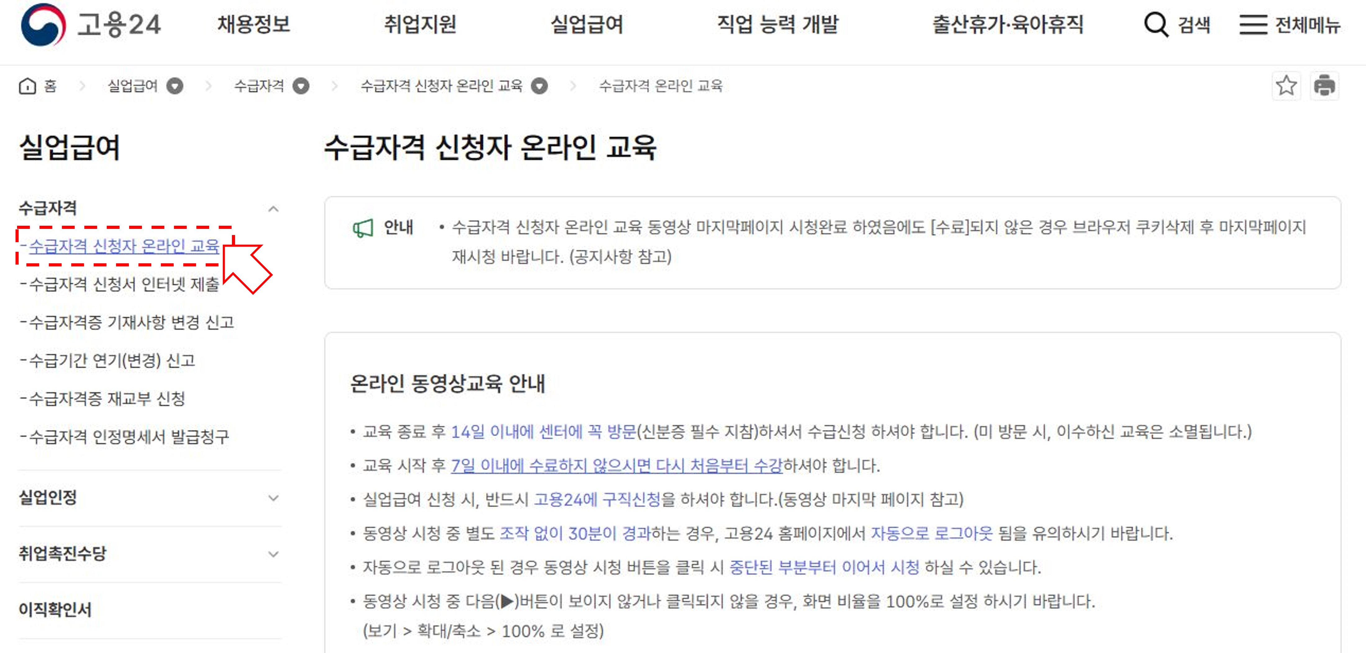 4) 동영상 시청 중 별도 조작 없이 30분이 경과하는 경우, 고용24 홈페이지에서 자동으로 로그아웃 됨을 유의하시기 바랍니다.