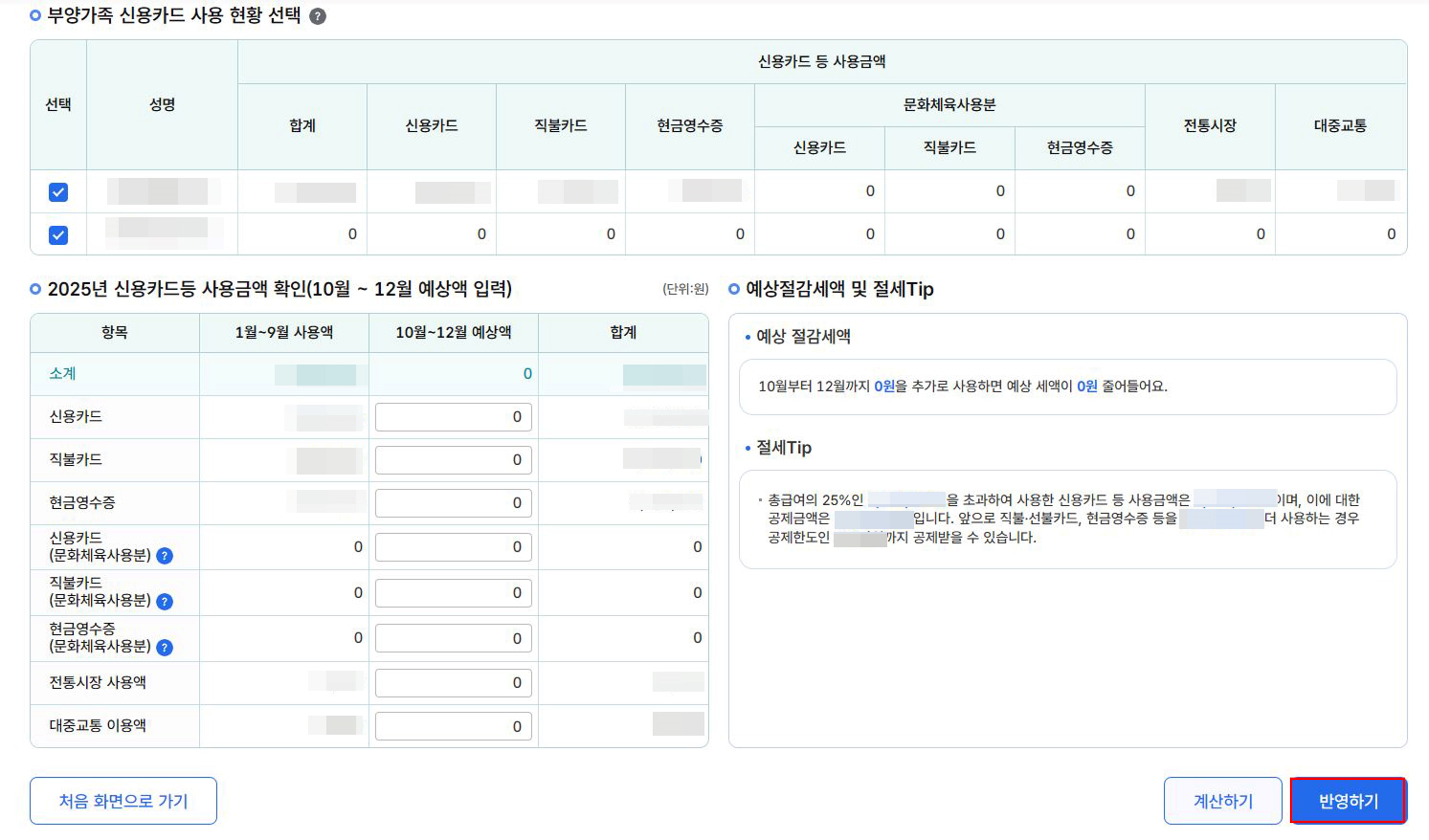 7. 2025년 신용카드등 사용금액 확인(10~12월 예상액 입력) 반영하기 클릭