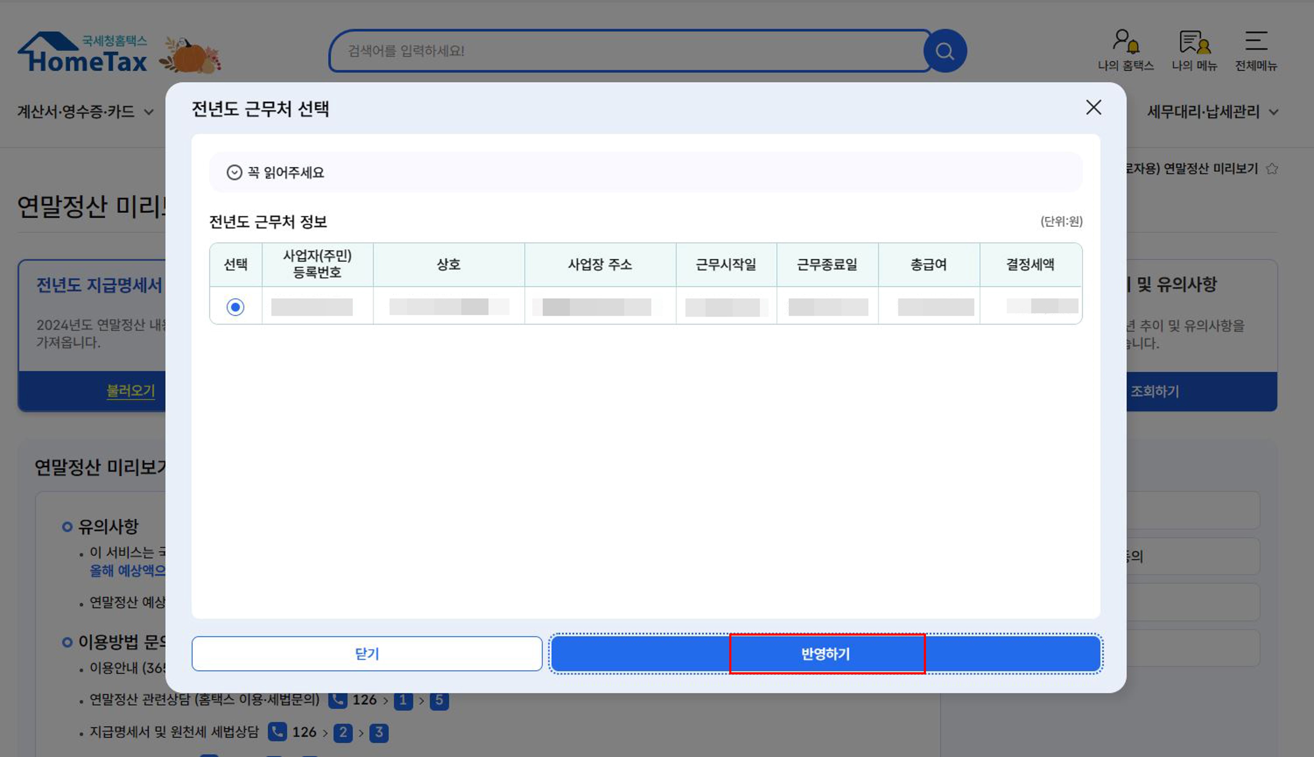 5. '전년도 근무처 선택' → '반영하기'클릭
