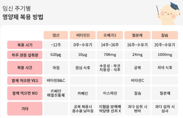 엽산: 엽산은 임신 초기부터 복용해야 하는 필수 영양소입니다. 태아의 신경관 발달에 중요한 역할을 하며, 선천적 결함의 위험을 줄이는 데 도움을 줍니다. 임신 전부터 복용하는 것이 이상적입니다.