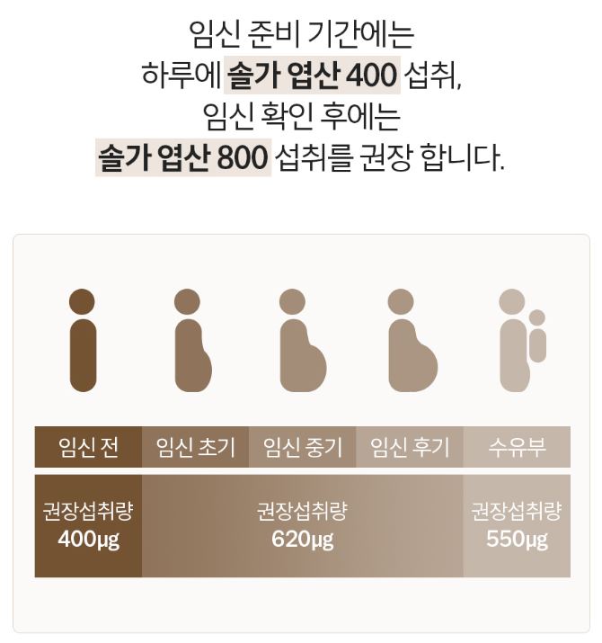 임신 전: 임신을 계획하는 여성은 임신 3개월 전부터 엽산을 복용하는 것이 좋습니다. 이는 신경관이 형성되는 초기 단계에 필요한 영양소를 미리 공급하기 위함입니다.