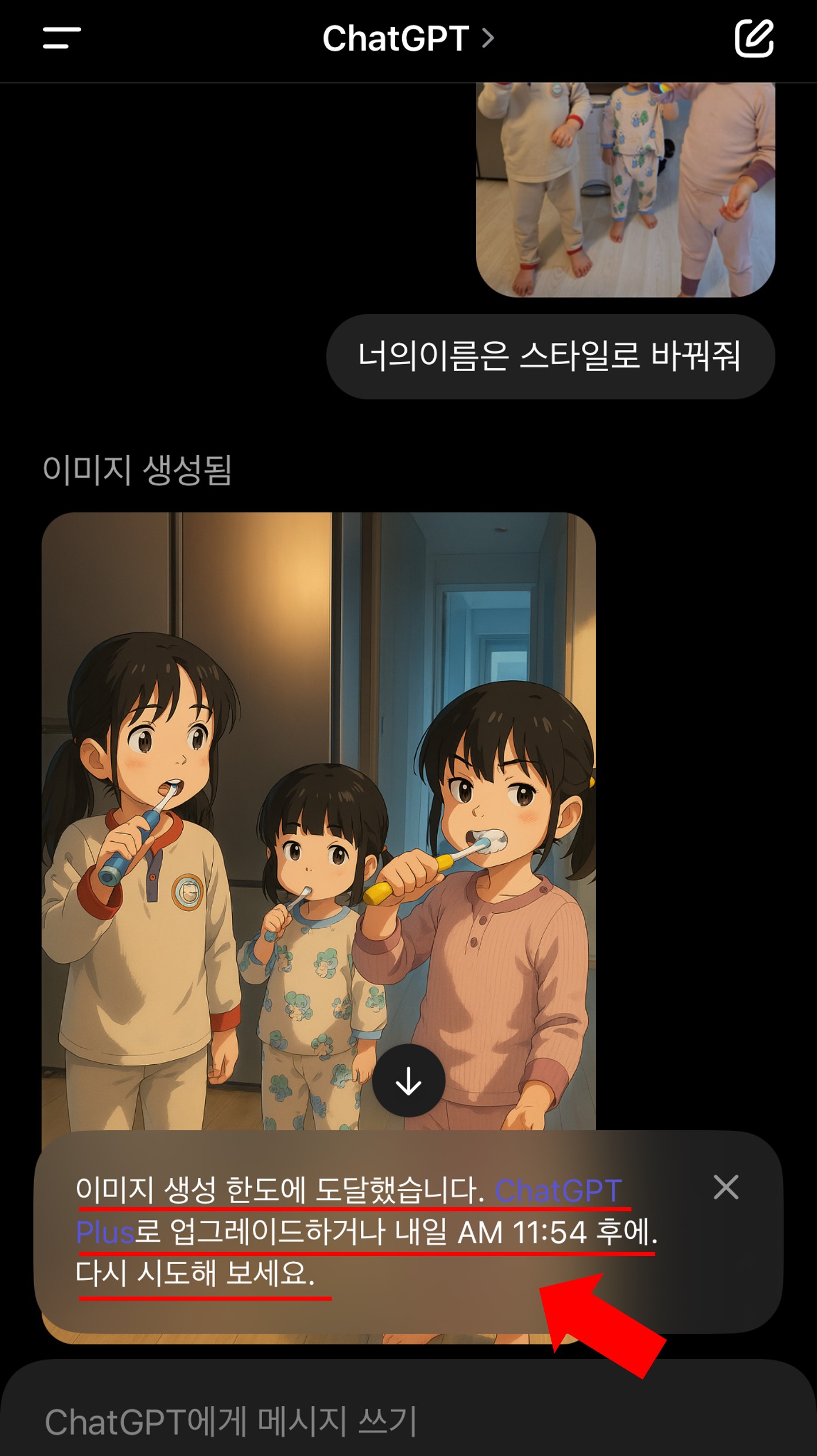 "이미지 생성 한도에 도달했습니다. chatGPTPlus로 업그레이드하거나 내일 AM11:54후에 다시 시도해 보세요라고 뜨네요. 저는 유로로 아직 사용할 의사가 없기에 내일 또 이미지 바꿔보려고합니다.