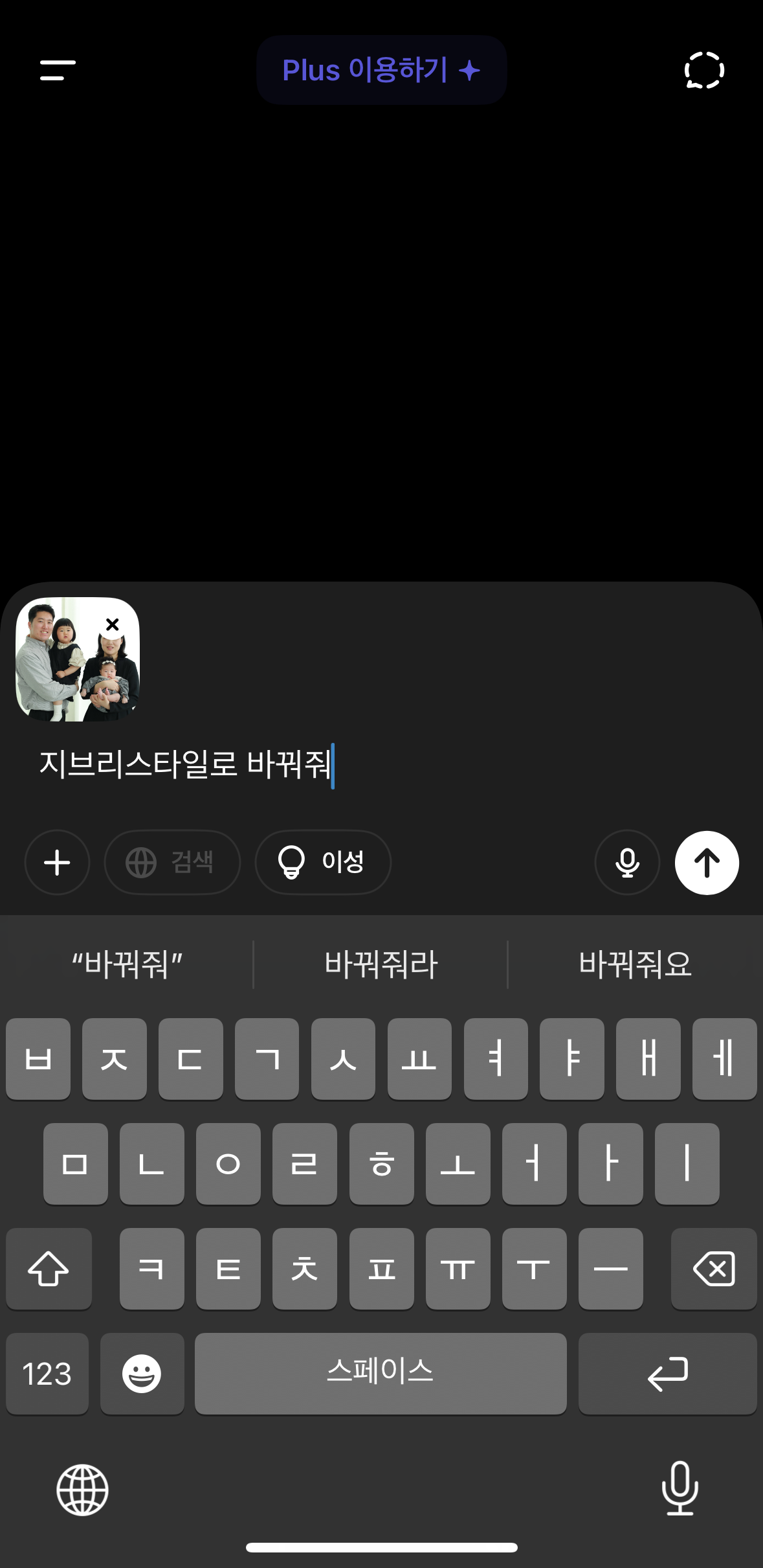 02.chatgpt를 활성화 시킨후, 하단에 +아이콘을 클랙해 원하는 이미지를 업데이트하여 "지브리 이미지로 바꿔줘" 명령어를 입력합니다.