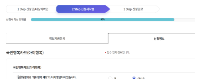 STEP 11. 국민행복 카드인 아이행복카드 신청여부를 체크해야 합니다.