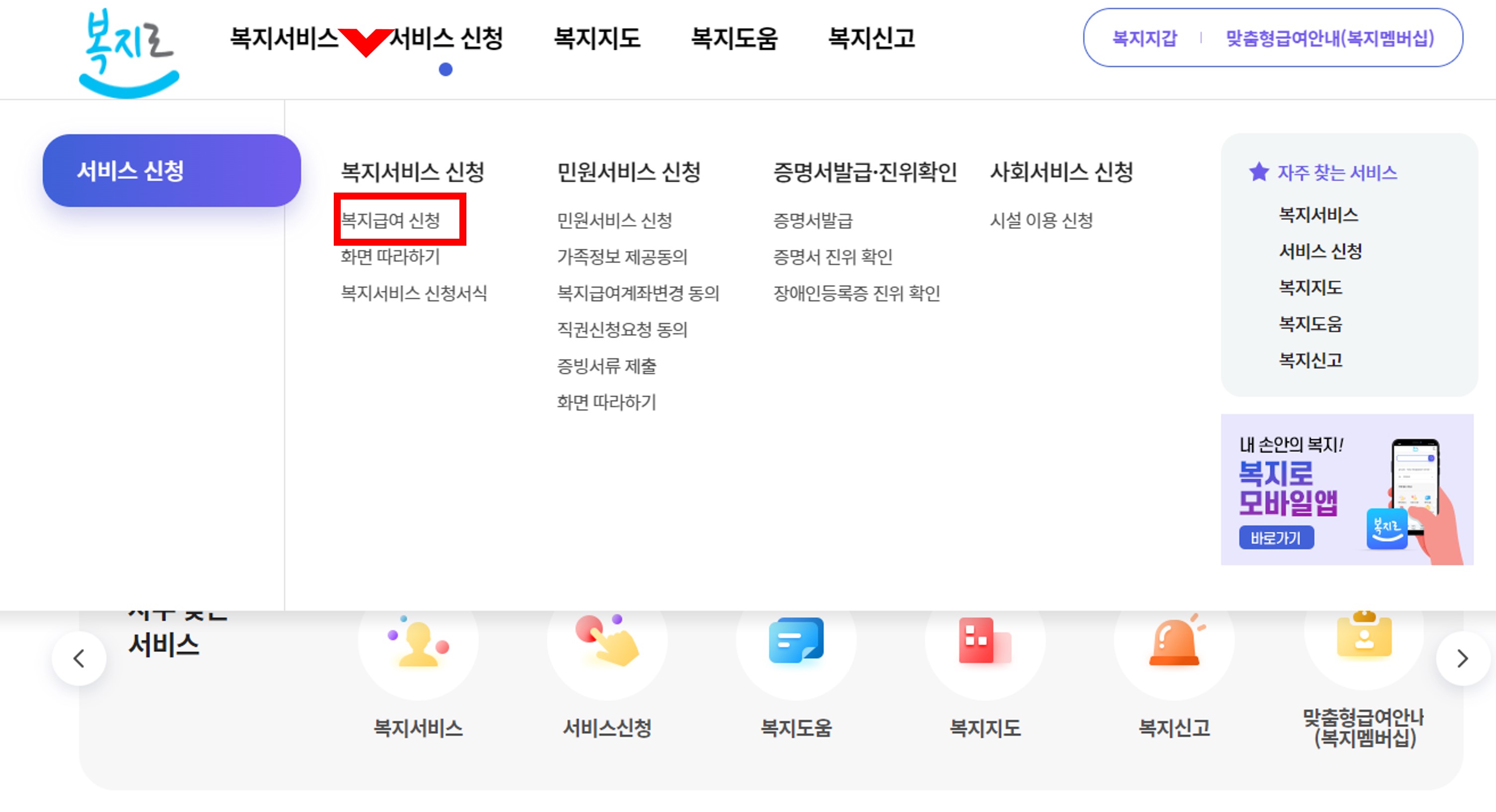 STEP 04. 상단의 서비스 신청 클릭 ▶ 복지서비스 신청 ▶ 복지급여 신청을 클릭해주세요~!