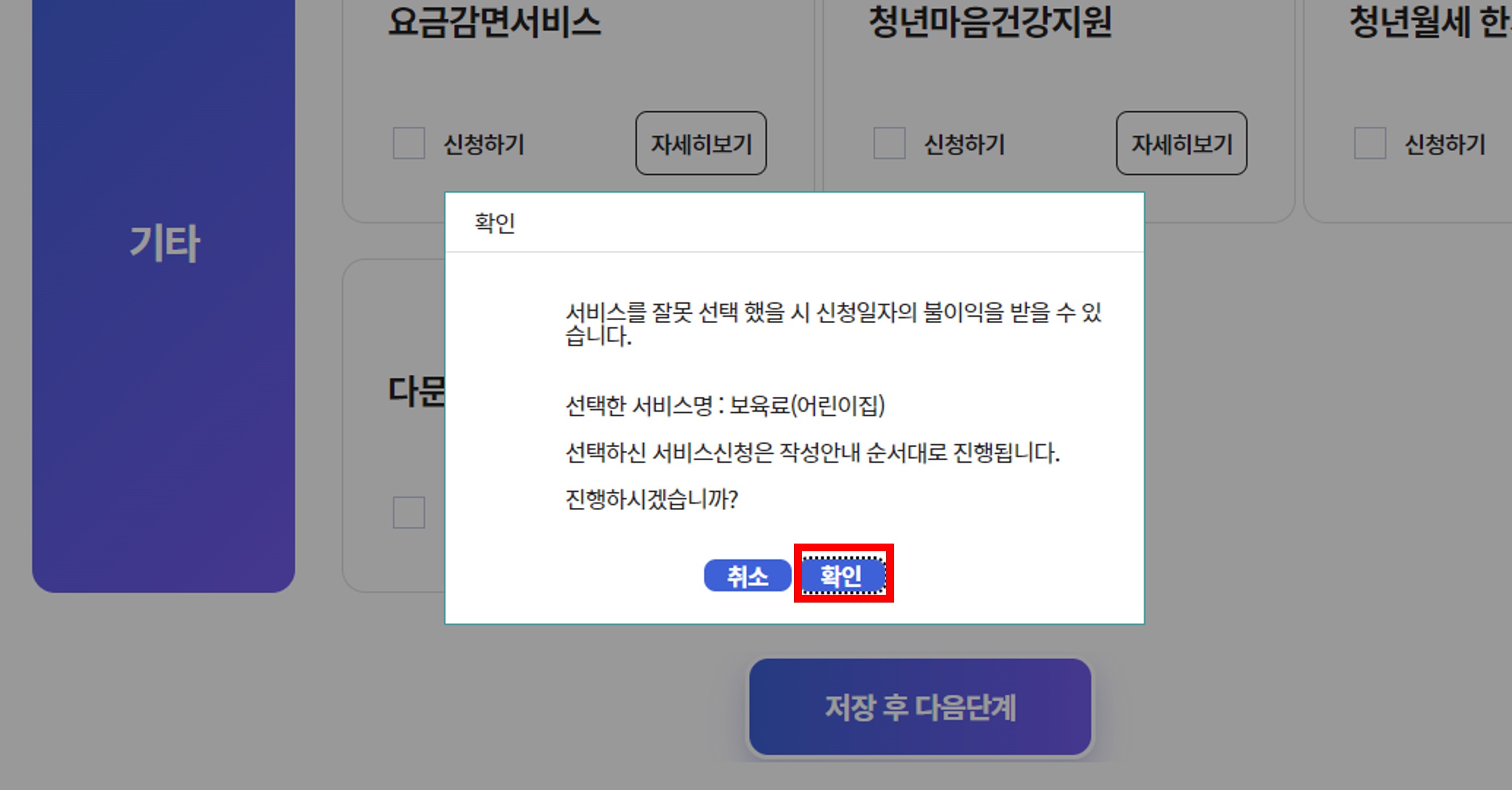 STEP 05. 보육료(어린이집) 클릭  스크롤 내린 후 저장 후 다음 단계를 클릭해주세요