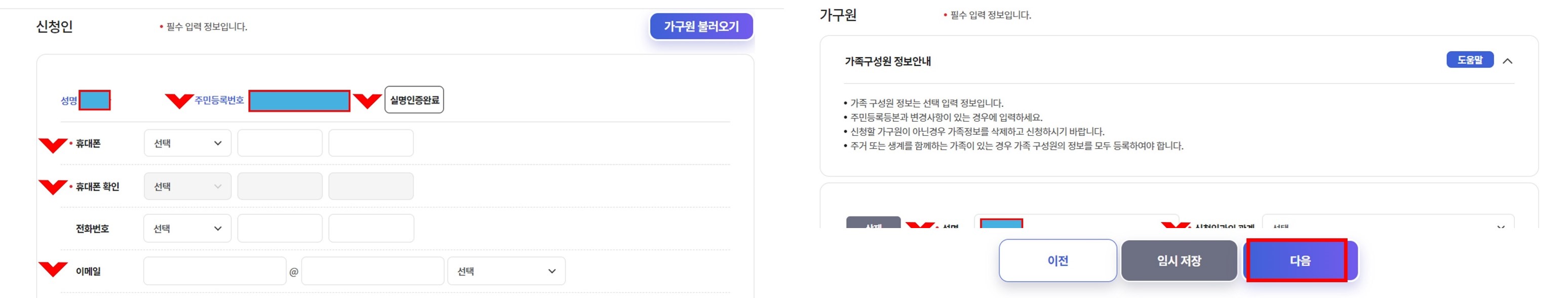 그외에 이메일, 휴대폰번호, 통지방법, 가구원과 아동정보를