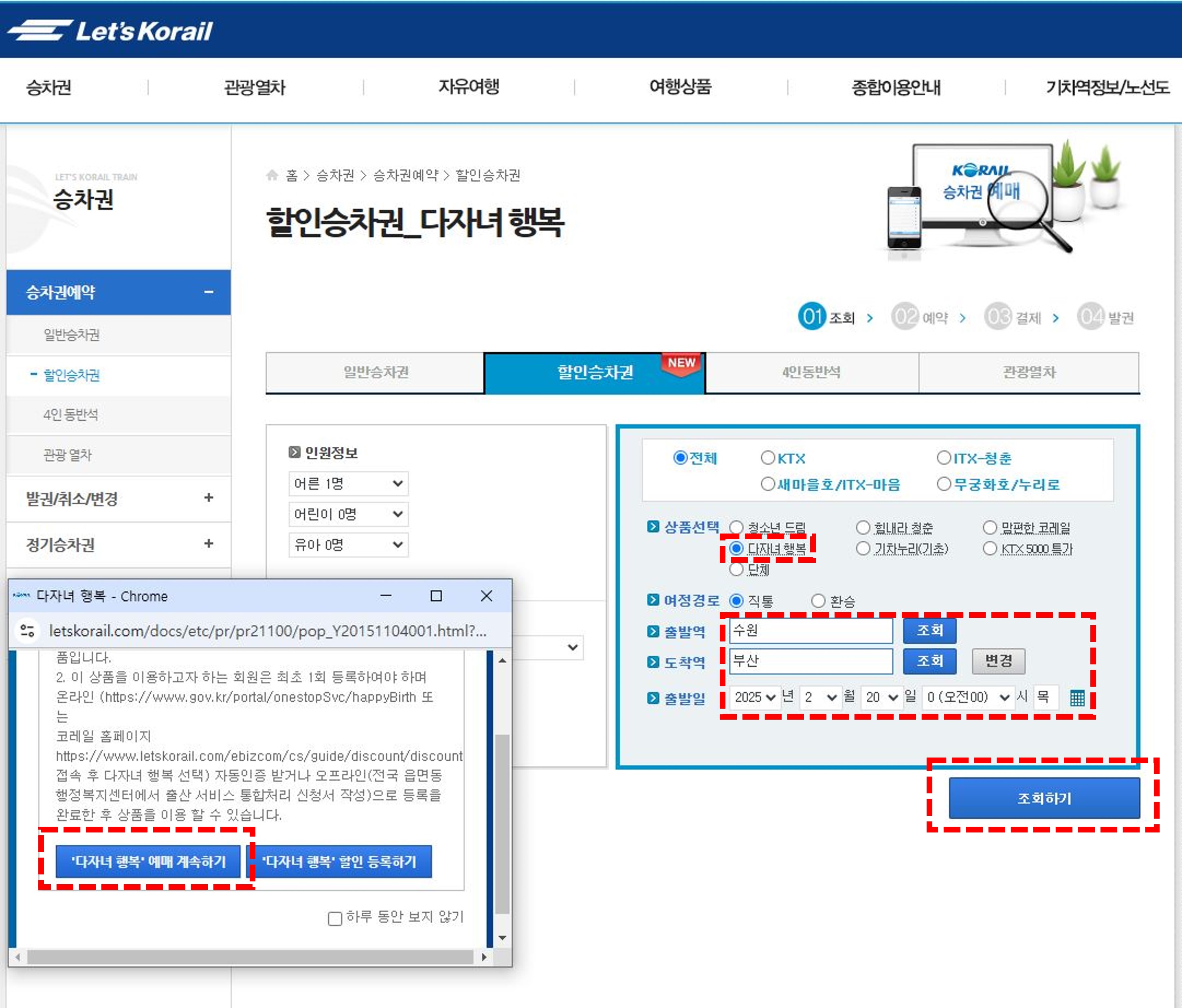 02. 다자녀 행복"예매 계속하기를 클릭한 후 "다자녀 행복"을 클릭합니다. 그리고 출발역과 도착역, 출발일을 기입한 후 조회하기를 클릭해 주세요.
