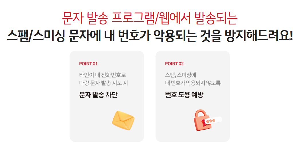 타인이 내 전화번호로 문자 발송 시도 시 이를 탐지하고 차단하는 기능입니다. 문자 인증 사기나 스미싱 피해를 사전에 방지할 수 있습니다.