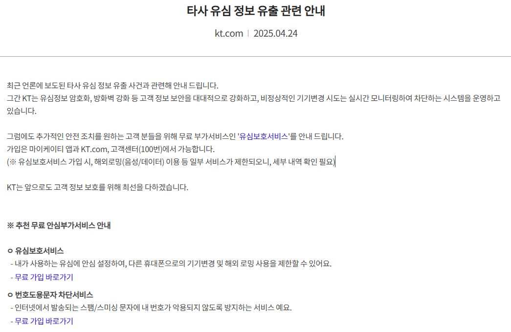 특히 유심(USIM)은 스마트폰의 핵심 정보가 담겨 있어 도난이나 해킹 시 가장 먼저 노출되는 부분 중 하나입니다. 이에 따라 타 통신사 이용자들 사이에서도 보안 서비스 가입에 대한 관심이 높아지고 있으며, KT 사용자라면 지금이 바로 유심보호 서비스와 안심 부가 서비스를 점검해야 할 시점입니다.