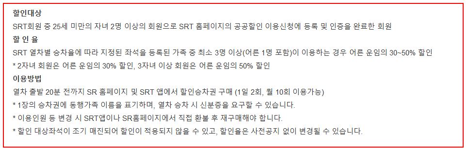 이전글에서는 코레일 KTX할인 방법에 대해서 알아보았습니다. KTX와 같이 SRT도 다자녀 가족 할인 혜택이 있습니다.