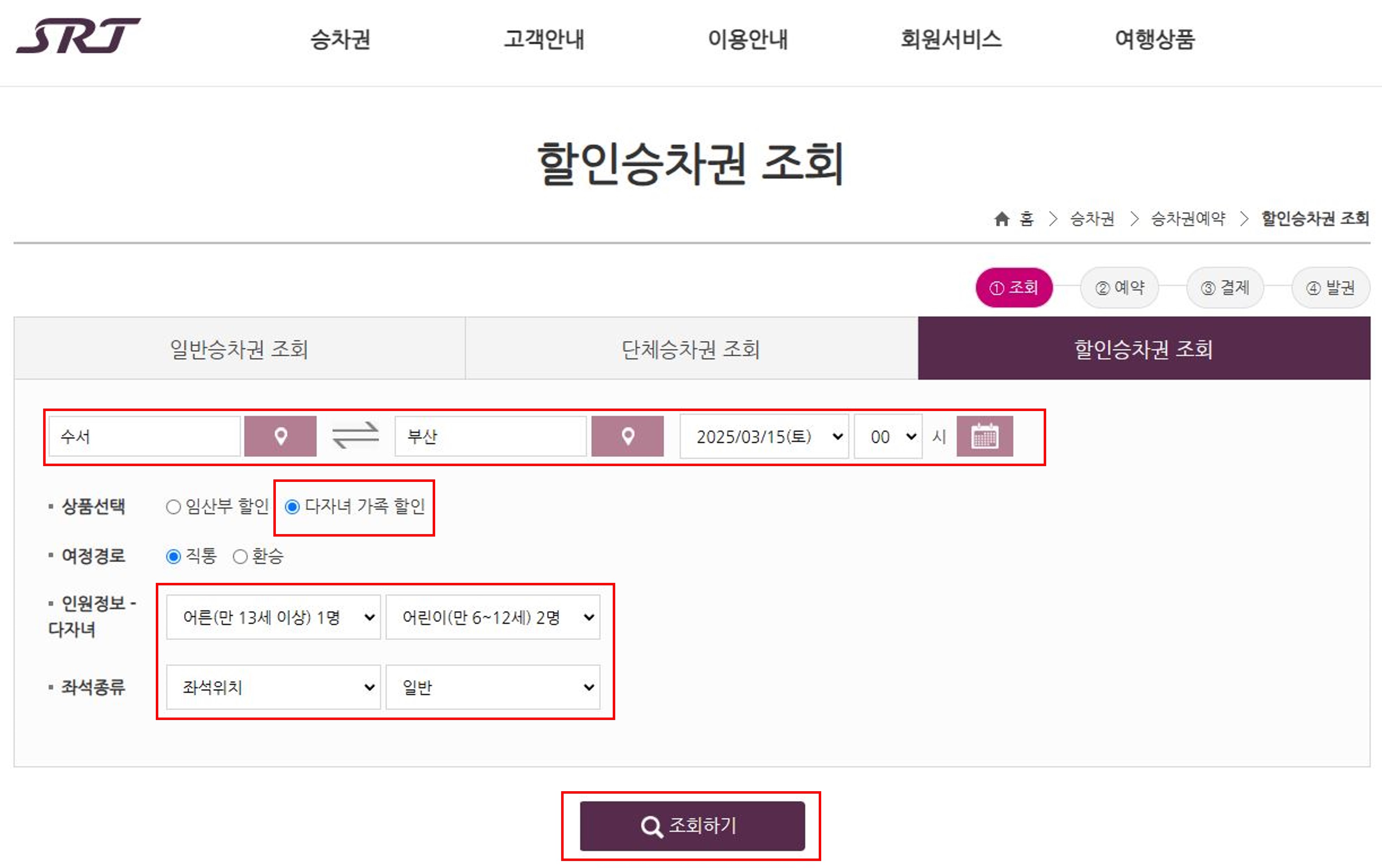 02. 할인승차권을 조회합니다. 출발지, 도착지, 일시를 입력합니다. 상품선택에서 "다자녀 가족 할인"을 클릭하세요. 인원정보 및 좌석종류도 설정한후 조회하기를 클릭합니다.