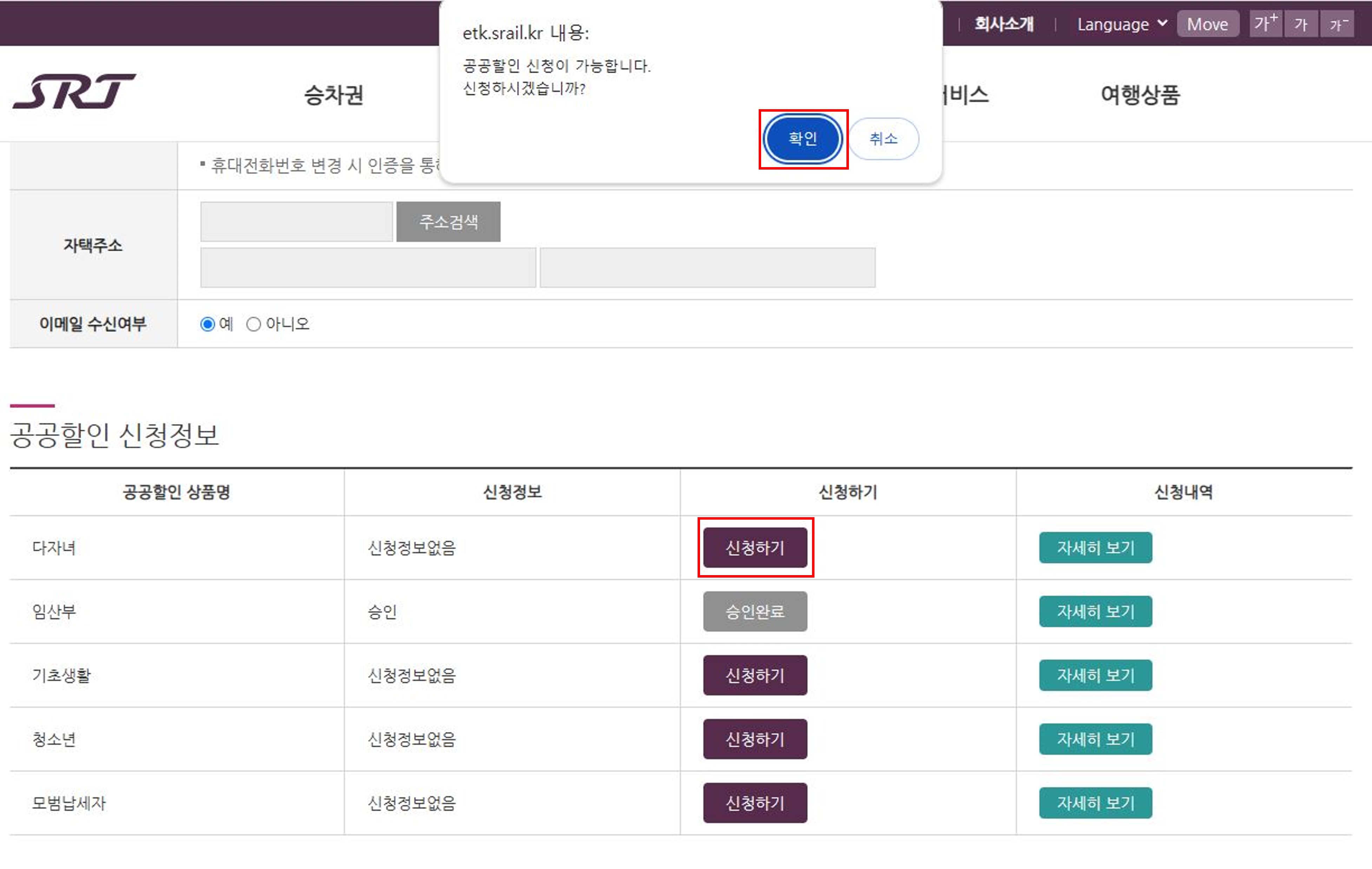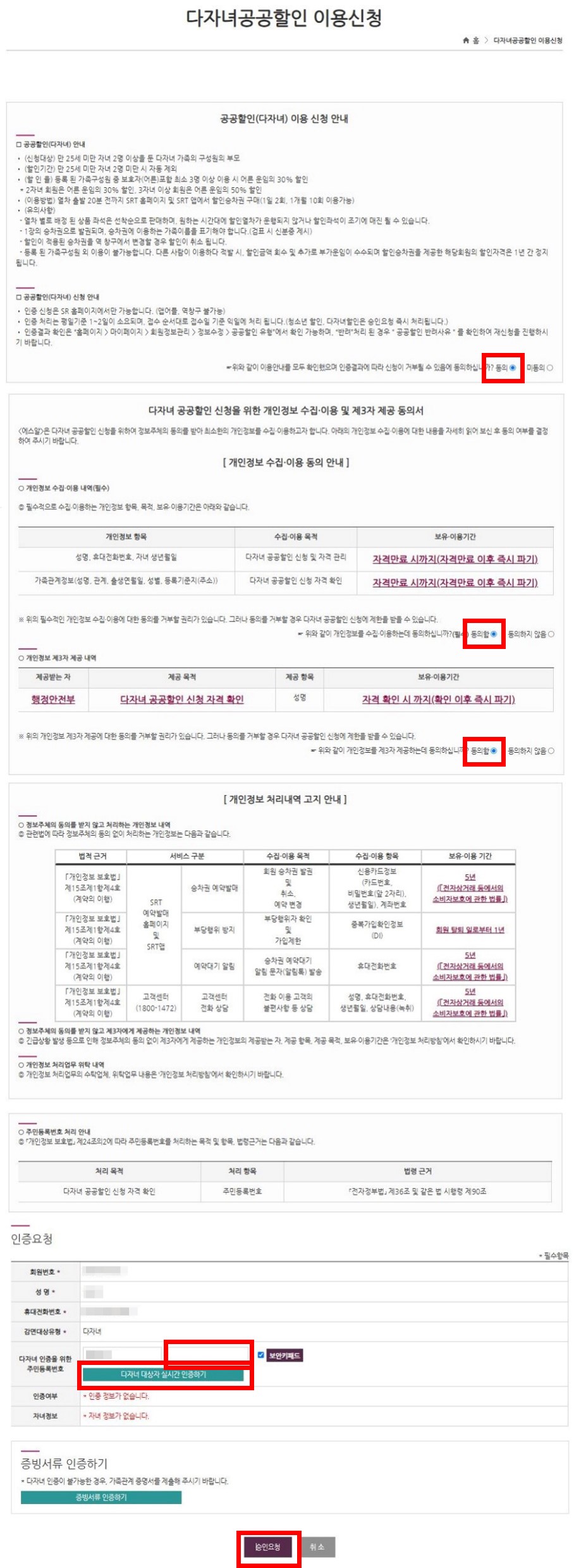 03.공공할인 신청정보의 다자녀칸에 신청하기를 클릭한 후 확인을 클릭 합니다.