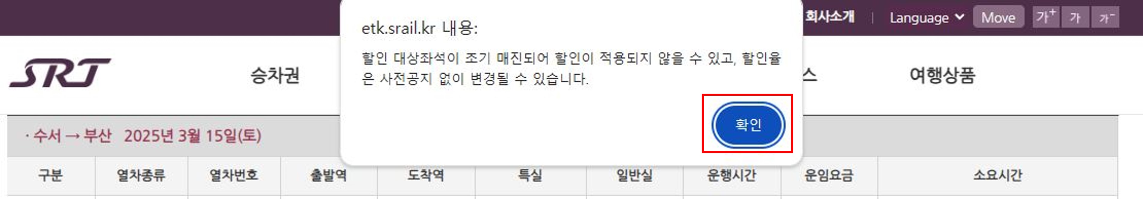 04. 할인 대상좌석이 조기 매진되어 할인이 적용되지 않을 수 있고, 할인율은 사전공지 없이 변경될 수 있습니다.의 "확인"을 클릭합니다.