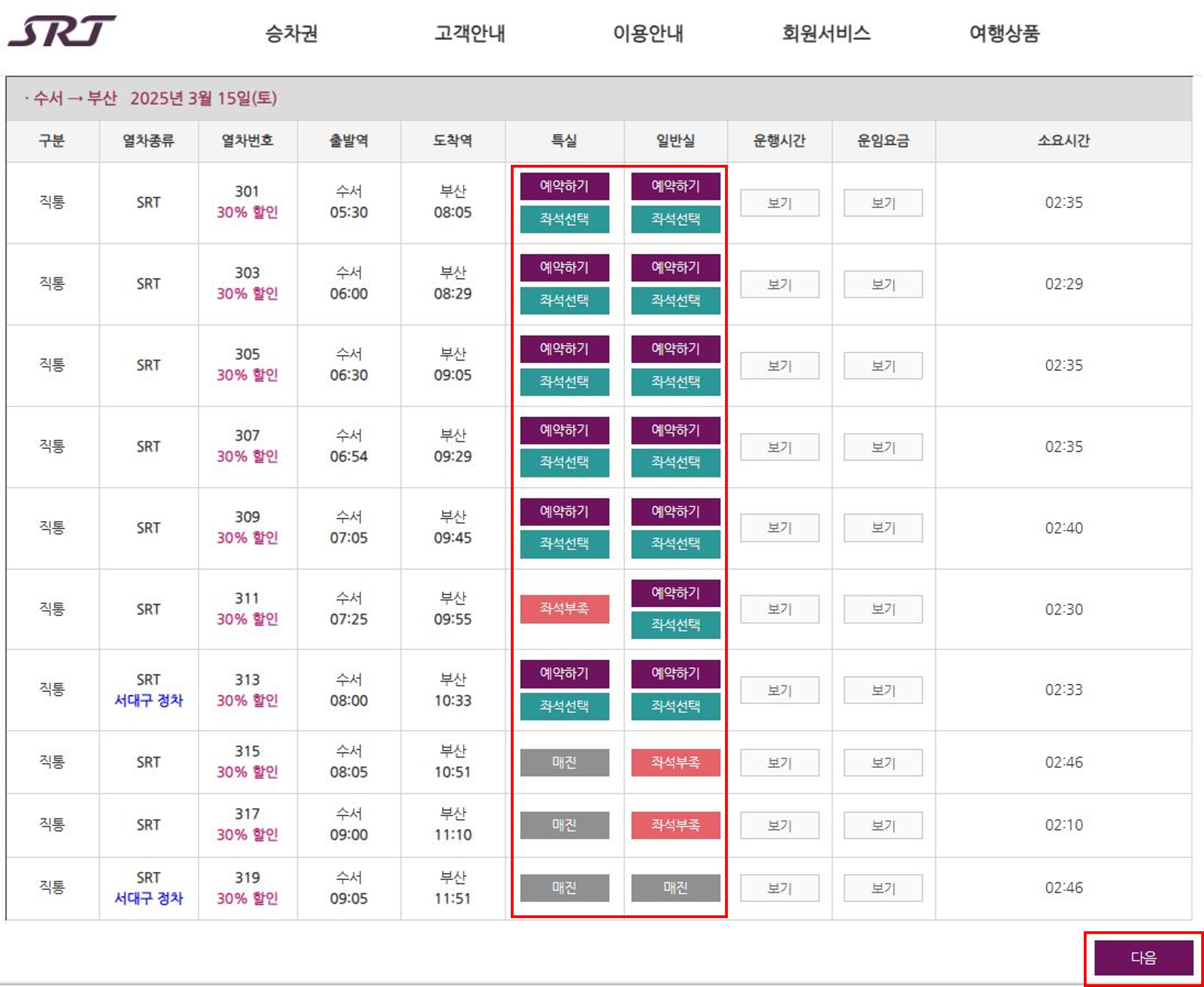03. 승차권이 조회가 되면 원하는 시간대의 "예약하기"를 클릭한 후 "다음"을 클릭하세요.