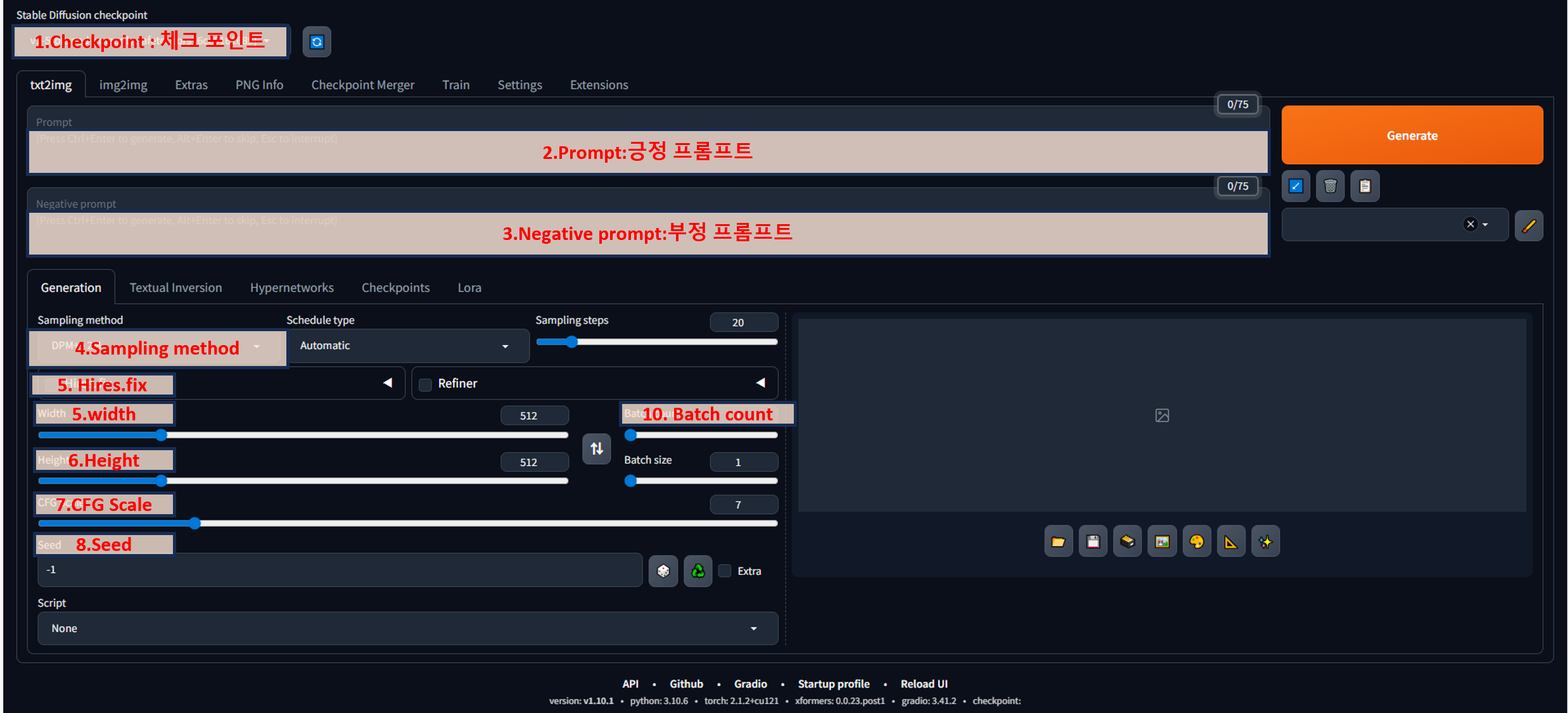 Stable Diffusion WebUI 실행 방법과 화면 설정 이해하기 (프롬프트·Checkpoint 기초)