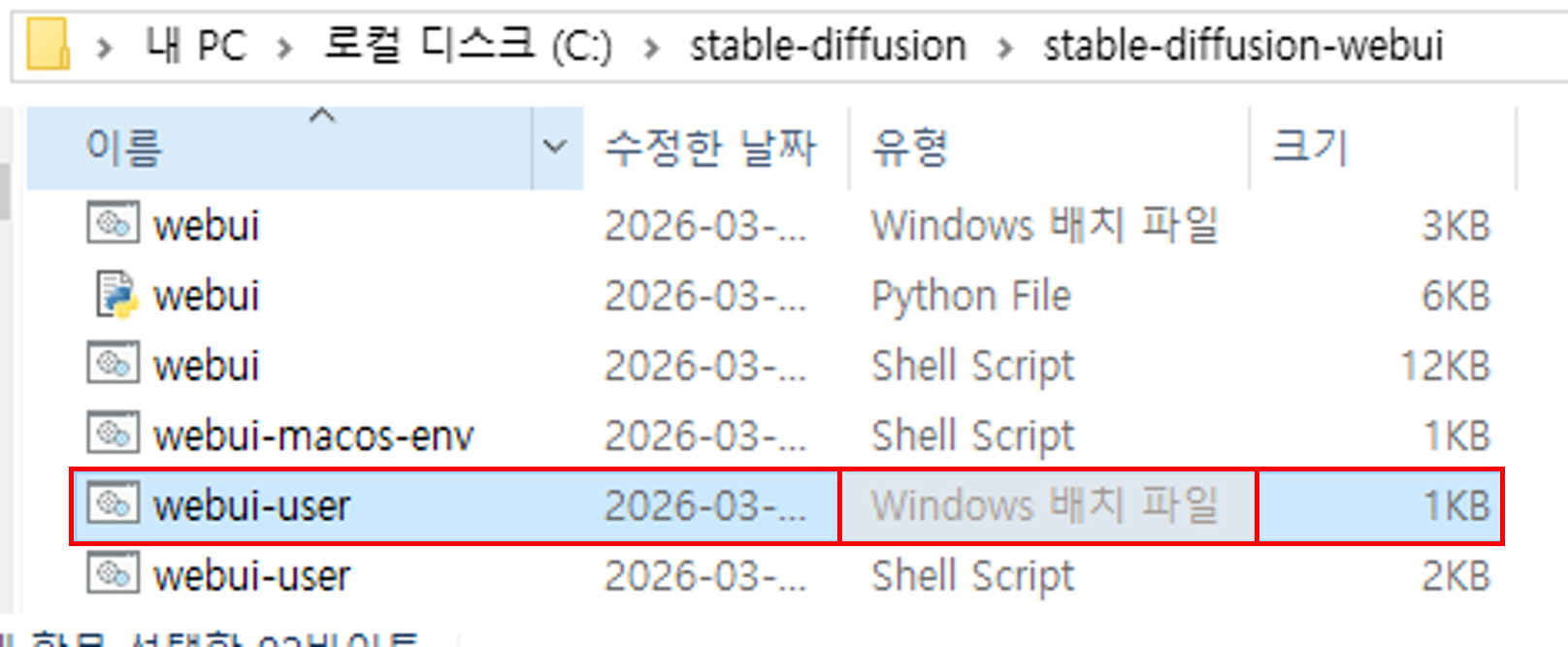 Stable Diffusion 설치가 완료되었다면 가장 먼저 해야 할 일은 WebUI를 실행하는 것입니다. 설치 과정에서 생성된 stable-diffusion-webui 폴더를 열면 여러 파일이 보이는데, 그 중에서 webui-user.bat 파일을 실행하면 됩니다.